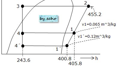 各状態点の比エンタルピー h1 = 405.8 kJ/kg h1'= 400.8 kJ/kg h2 = 455.2 kJ/kg h3 = 243.6 kJ/kg