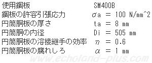 この受液器に内圧として設計圧力1.6Mpaが作用した場合に、円筒胴板に誘起される最大の引張応力接線方向の引張応力(σt)となる。