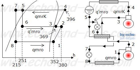 図を見てください。中間冷却器のバイパス冷媒循環流量q´mro、qmro、qmrkをイメージしましょう。。