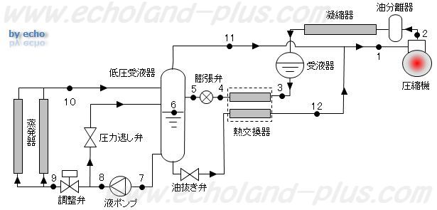ポンプで強制的に冷媒液を蒸発器に送り込む。H21年度とクリソツですが、アンモニア冷媒仕様となっておりまする。なので、油抜き弁が低圧受液器の底部に付いています。