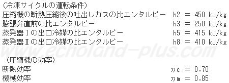 この装置において、圧縮機の冷媒循環量は qmr = 0.4kg/s、蒸発器Ⅰを流れる流量と蒸発器Ⅱを流れる流量の比は1:1であり、この装置の冷凍サイクルの運転条件と圧縮機の効率は下記のとおりである。