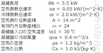 Φk = Ca・ρa・qva(ta2 - ta1) 5.5 = 1.0×1.2×0.4×(ta2 - 30) 5.5 = 0.48×(ta2 - 30) ta2 = 41.458333 ≒ 41.5