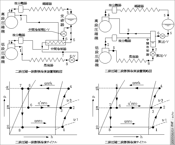 下記の図は平成10年5月31日の第一種冷凍機械講習検定問題の問題1です。一段膨張方式と二段膨張方式の概略図とp-h線図があります。 この問題は、この両方の装置を説明するのにもってこいの問題です。(多段圧縮冷凍装置の原理やp-h線図の説明は省略します。一種冷凍機械責任者用のテキストを読んでください。)