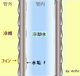 水冷凝縮器では、冷却水側の熱伝達率が冷媒側のそれの2倍以上と大きいので、冷却水側にフィン加工して伝熱面積を大きくしている。