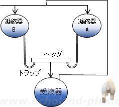 2台の凝縮器において、ヘッダを利用し、液落とし管を1本にまとめて1台の受液器に配管する場合、ヘッダへの液落とし管にトラップがないと、圧力降下の大きいほうの凝縮器内に疑縮液がたまる。