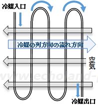 図のような冷媒と空気の流れが同じ方向の「並流」にすると、赤の部分は「冷媒の過熱領域の伝熱面積はほとんど蒸発器の熱交換に寄与しない。」ということになり、過熱に必要な管路が長く必要である。