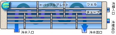 概略図は乾式シェルアンドチューブ蒸発器で、管内に冷媒が通り、管外の冷水(ブライン)を冷却しています。乾き飽和蒸気線より若干右にある点1が、若干過熱状態になった蒸気になります。