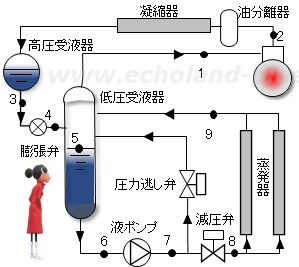 ・冷媒液強制循環式用フィンコイル蒸発器の低圧受液器容積は、運転状態により冷媒液が圧縮機に吸い込まれないように低圧受液器の冷媒液面レベルを検知して、冷媒液の供給量を検知する。 by echo