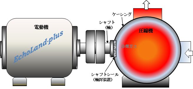 ・この圧縮機を密閉圧縮機といい、シャフトシールは、不要である。