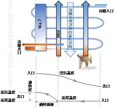 【◯】 向流(対向流ともいう)とは、蒸発器を通過する空気の流れ方向と、冷媒の列方向の流れの方向を、互いに逆方向になるようにする。過熱部の伝熱は、蒸発部よりかなり悪くなるため向流にすること