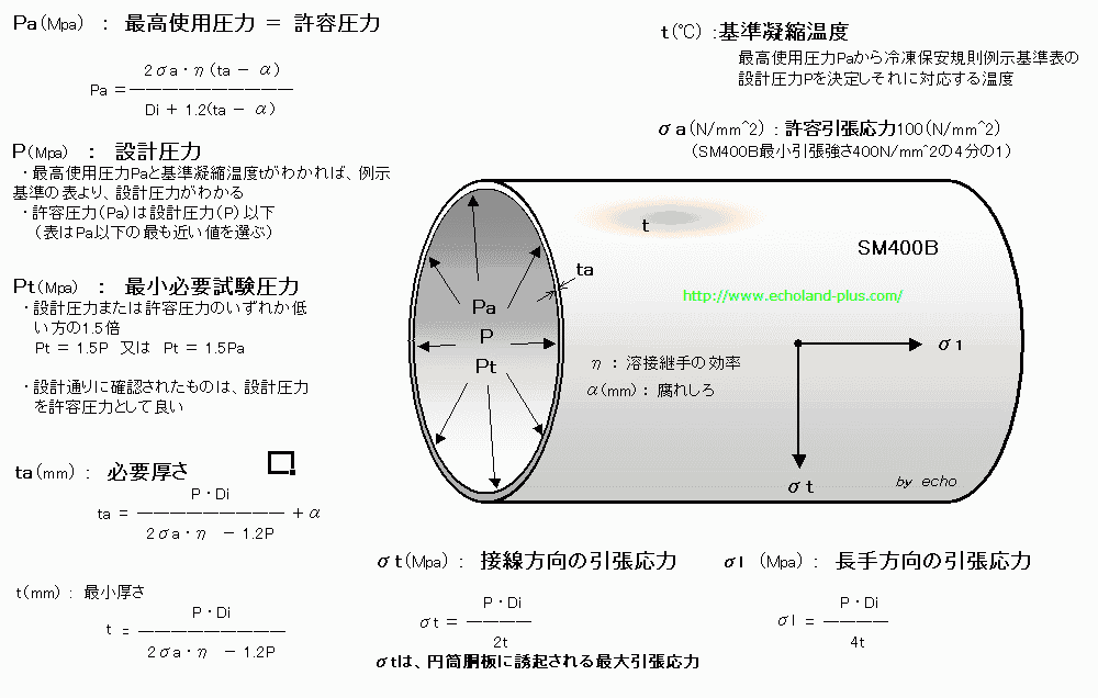 引張応力とは、冷凍機の円筒胴では接線方向と長手方向の応力で、両方とも同じように 内圧Pと円筒胴内径Diに比例し、円筒胴板厚tに反比例する。