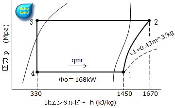 問2 アンモニア冷凍装置が下記の条件で運転きれている。このとき、圧縮機のピストン押しのけ量V(m3/h)と実際の圧縮機駆動の軸動力P(kW)はおよそいくらか。次の答えの(1)から(5)の組み合わせのうちからもっとも近いものを選べ。ただし、圧縮機の機械的摩擦損失仕事は吐出しガスに熱として加わるものとする。また、配管での熱の出入りおよび圧力損失はないものとする。