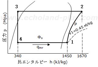 断熱圧縮後の吐出しガスの比エンタルピー h2 = 1670 kJ/kg