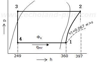 断熱圧縮後の吐出しガスの比エンタルピー h2 = 397 kJ/kg
