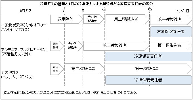 一 冷凍のためガスを圧縮し、又は液化して高圧ガスの製造をする設備でその一日の冷凍能力が三トン以上(二酸化炭素又はフルオロカーボン(可燃性ガスを除く。)にあつては、二十トン以上。アンモニア又はフルオロカーボン(可燃性ガスに限る。)にあつては、五トン以上二十トン未満。)のものを使用して高圧ガスを製造する者