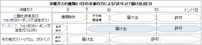 アンモニアガスの1日の冷凍能力による届け出と許可の区分